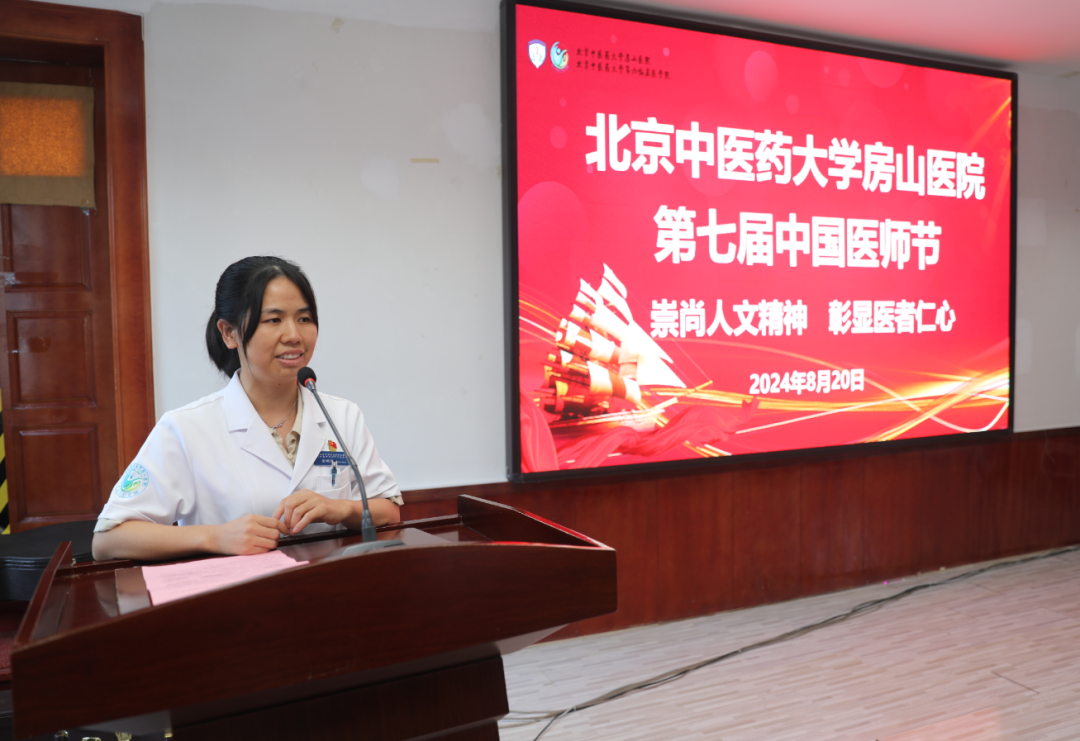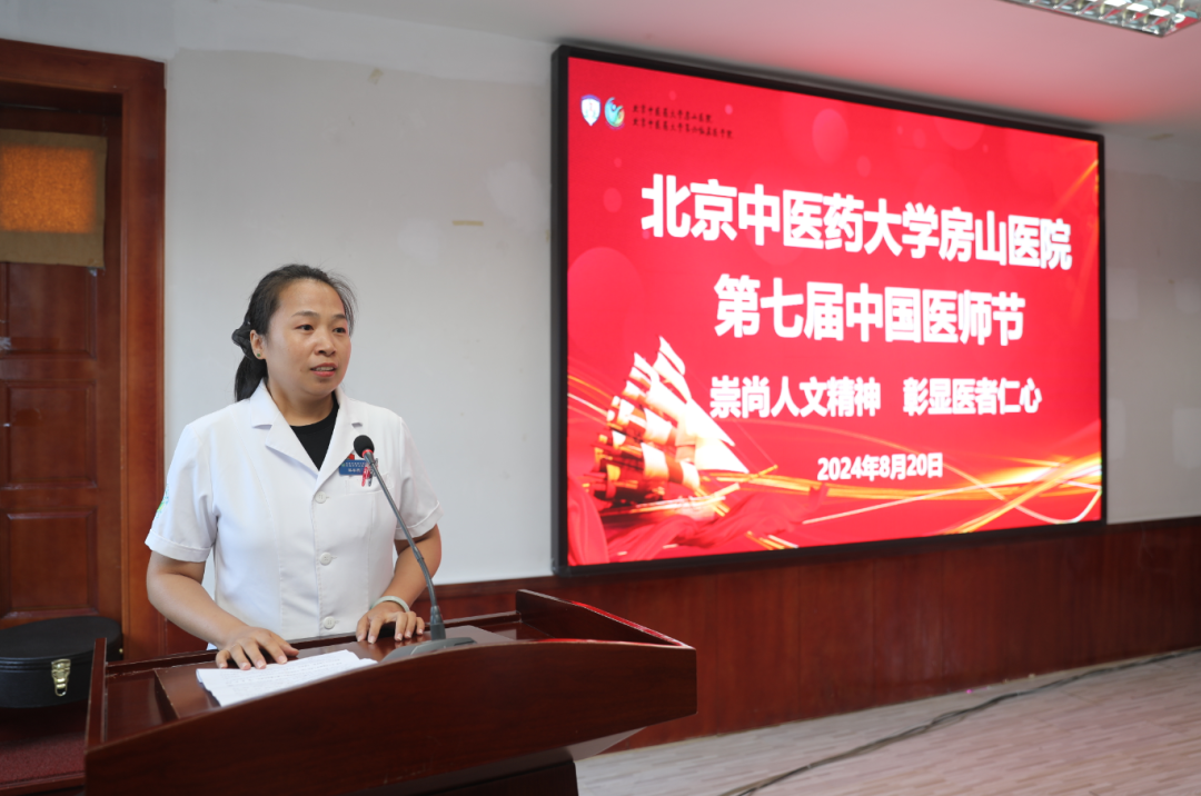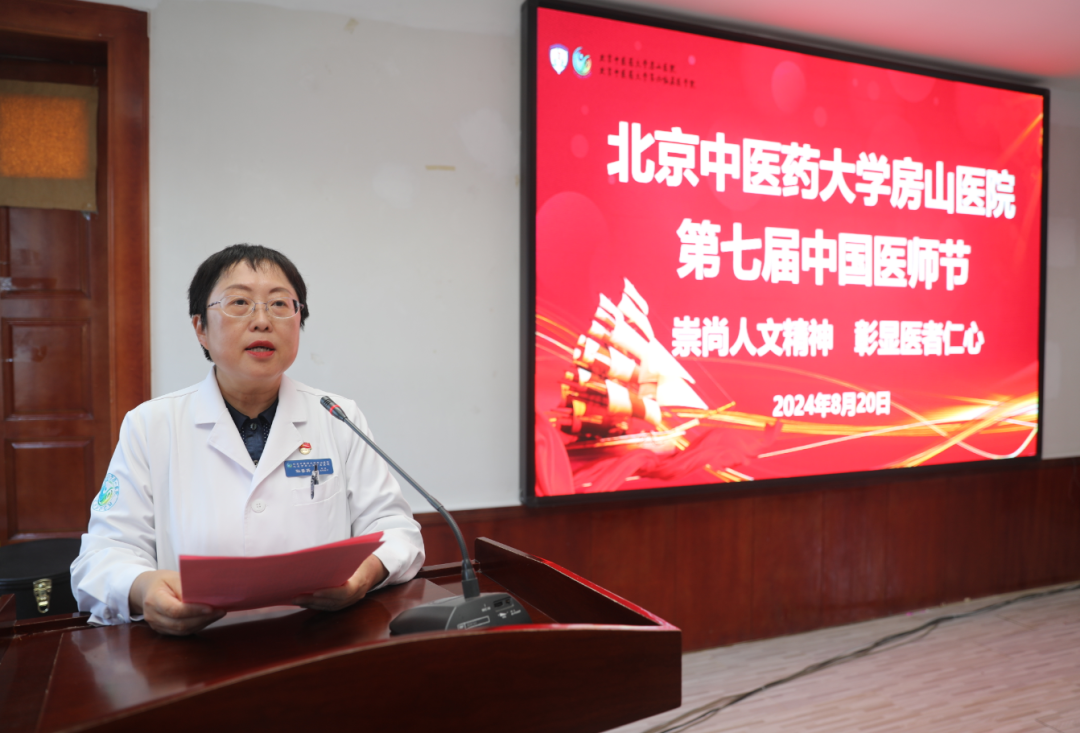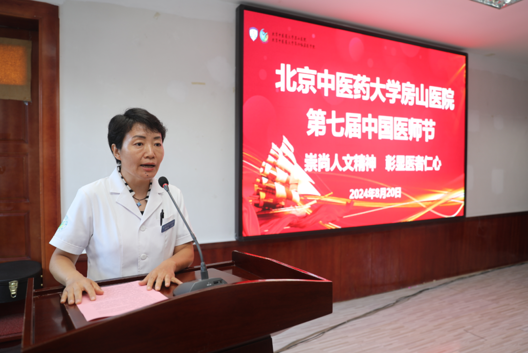 首先由孙鲁英院长致开幕词,对长期以来为医院发展建设作出卓越贡献的全体医师表示由衷的感谢!感谢房山区卫生健康委的大力支持和帮助!自2018年我院举办庆祝首届中国医师节以来,医师队伍逐步壮大,中医特色不断凸显、医疗质量稳步提升。一直以来,我院全体医师不仅在自己的岗位上出色的完成了繁重的医疗任务,更是在新冠疫情、抗洪救援等方面,不畏危险、迎难而上;对口支援、公益事业等工作也恪尽职守、无私奉献。她希望医师们要继续戮力同心,踔厉奋发;要以德为先,加强行风建设;要以学为本,提升业务能力;要以干为体,共谋医院发展。