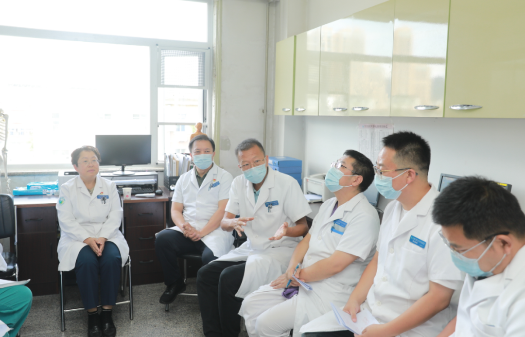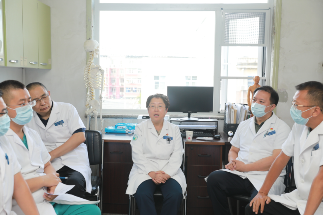 查房后,孙院长主持召开座谈会,骨伤科主任边朝辉对科室情况进行了详细介绍,他指出:骨伤科团队团结友爱、分工明确、充满干劲,今后将不断加强骨科微创技术的学习,以不断满足当下备受关注的诊疗需求。孙院长指出,骨伤科团队发展态势良好,人才梯队完善,在医护团队的协同配合下,各项工作稳步向前。当前科室发展的重点是不断提升医疗质量,发挥中医骨伤优势与特色,打造领域内良好品牌,惠及区域百姓。
