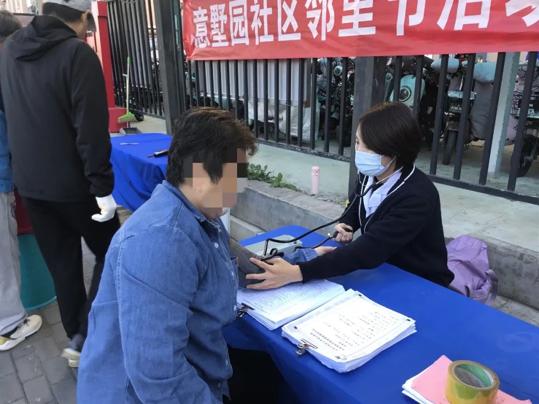在艺墅园社区,配合社区邻里节的活动,吕源主治医师为居民进行健康咨询、用药指导及监测血压,帮助居民制定符合自己的健康方案。