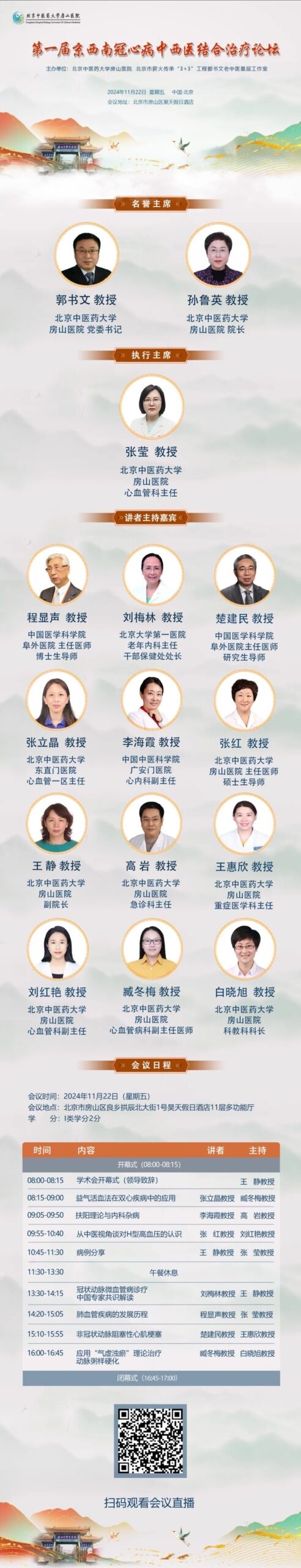 为强化中医特色优势与名医经验传承,提升中医药专业人员运用中医解决临床实际问题,由北京中医药大学房山医院、郭书文传承工作室、许心如传承工作室站房山区中医医院分站主办的“第一届京西南冠心病中西医结合治疗论坛”将于2024年11月22日在昊天假日酒店11层多功能厅举办。