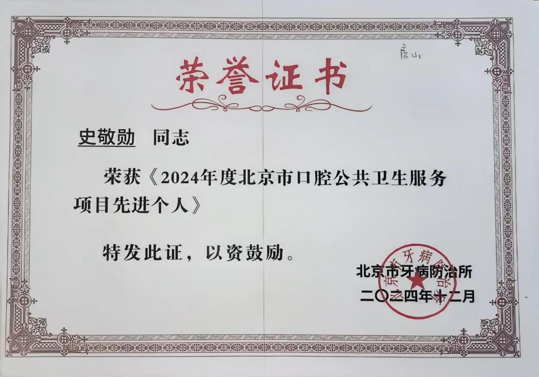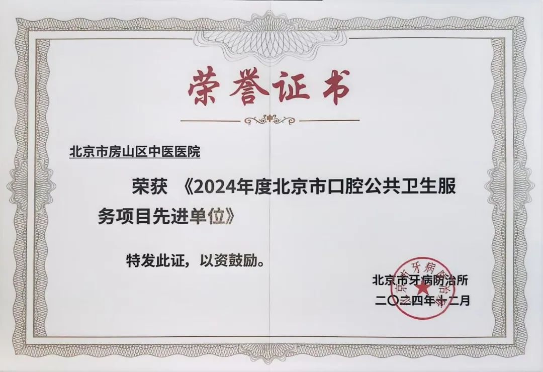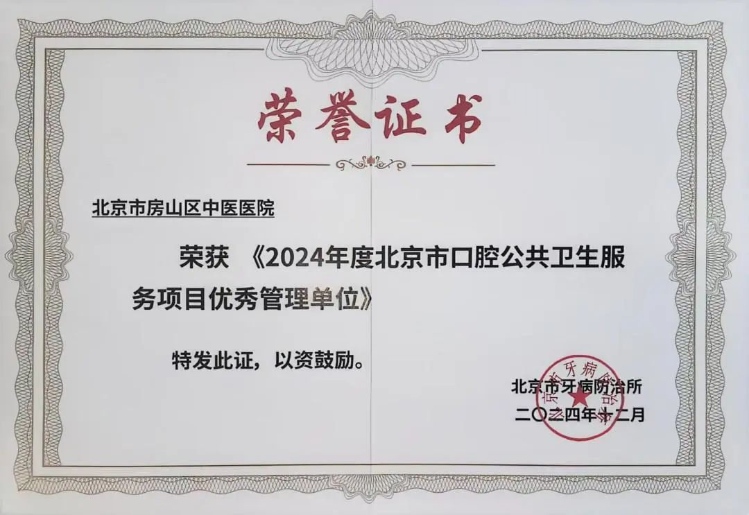 荣获“2024年度北京市口腔公共卫生服务项目优秀管理单位”、“2024年度北京市口腔公共卫生服务项目先进单位”两项集体荣誉,是对我院过去牙防工作的肯定,更是对未来发展的激励。我们将继续努力,为提升全民口腔健康水平不懈奋斗,为建设健康房山、健康北京贡献力量。