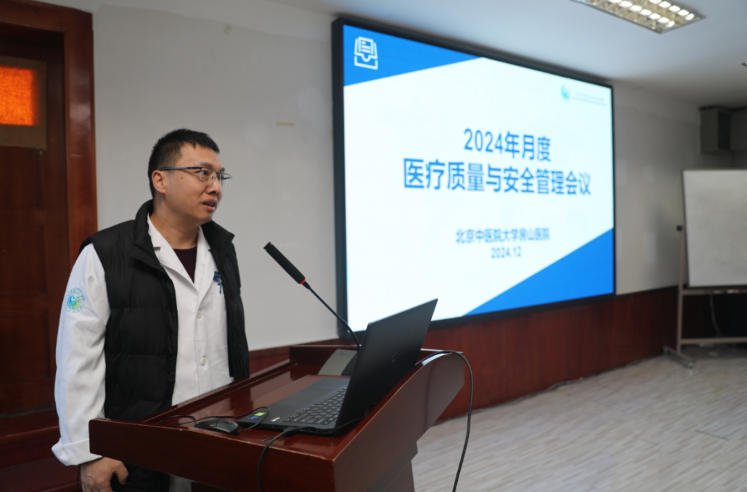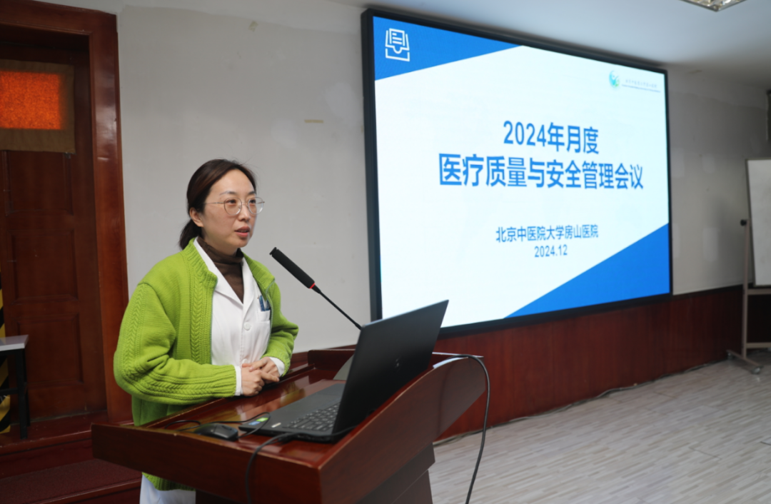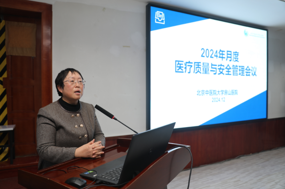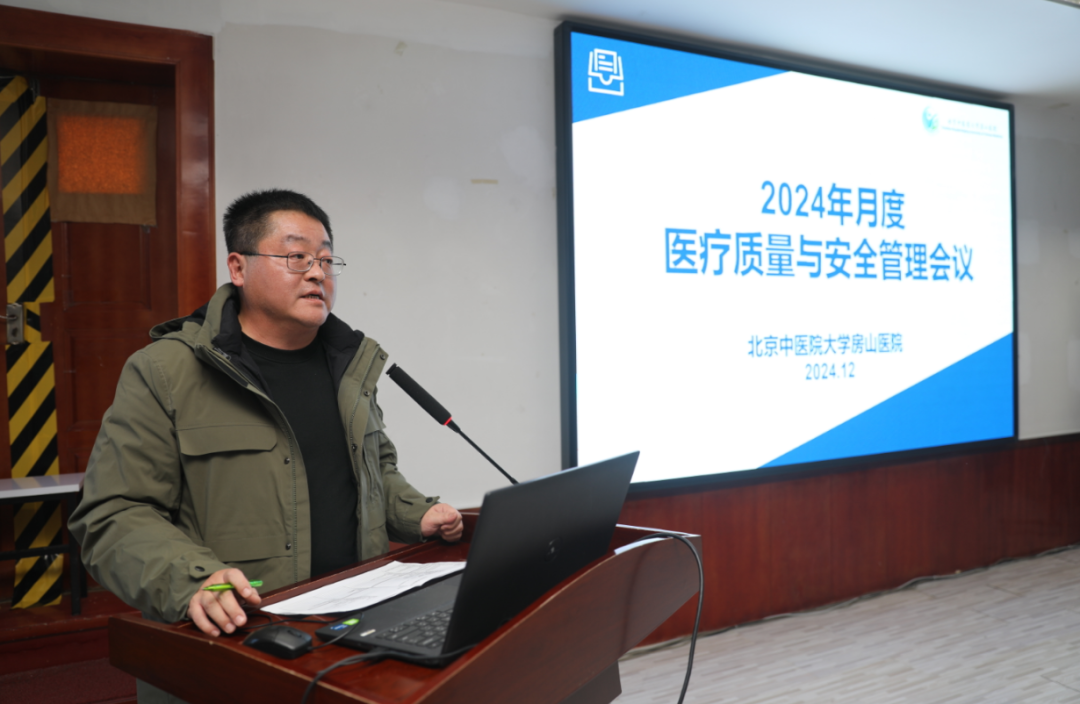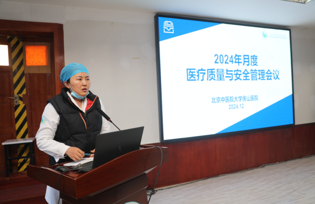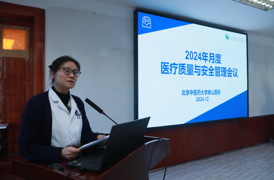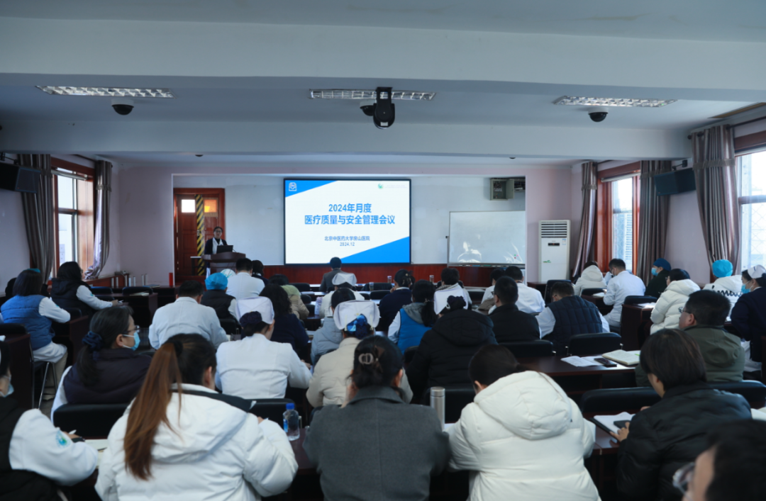 2024年12月24日,北京中医药大学房山医院召开月度医疗质量与安全管理会议。院领导班子、临床科室主任、质控员、护士长、医技科室及相关职能科室负责人在西二楼会议室参会。会议由医务科科长代阿秋主持。