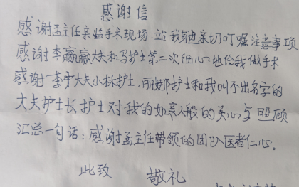 这封感谢信的背后,是一个充满关怀与专业的医疗团队。感谢信中提到的孟晓东主任,对患者的手术事项进行了详细的叮嘱,他的专业与负责让患者安心。李赢赢大夫和马护士在手术过程中展现出了高度的细心与专注,让患者在面对手术时多了一份安心和信任。那些患者叫不出名字的医护人员,他们就像患者的亲人一样,用温暖的话语和贴心的护理,让患者在病痛中感受到了无微不至的关怀。这种对患者如亲人般的呵护,如同冬日里的暖阳,温暖了患者的心灵。