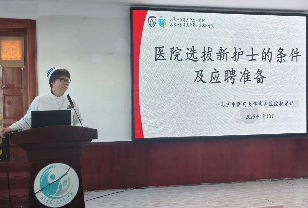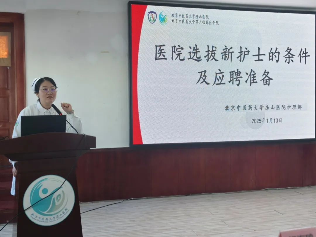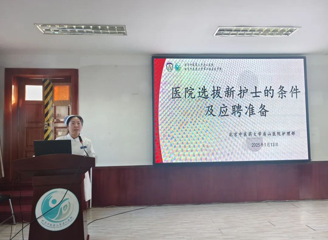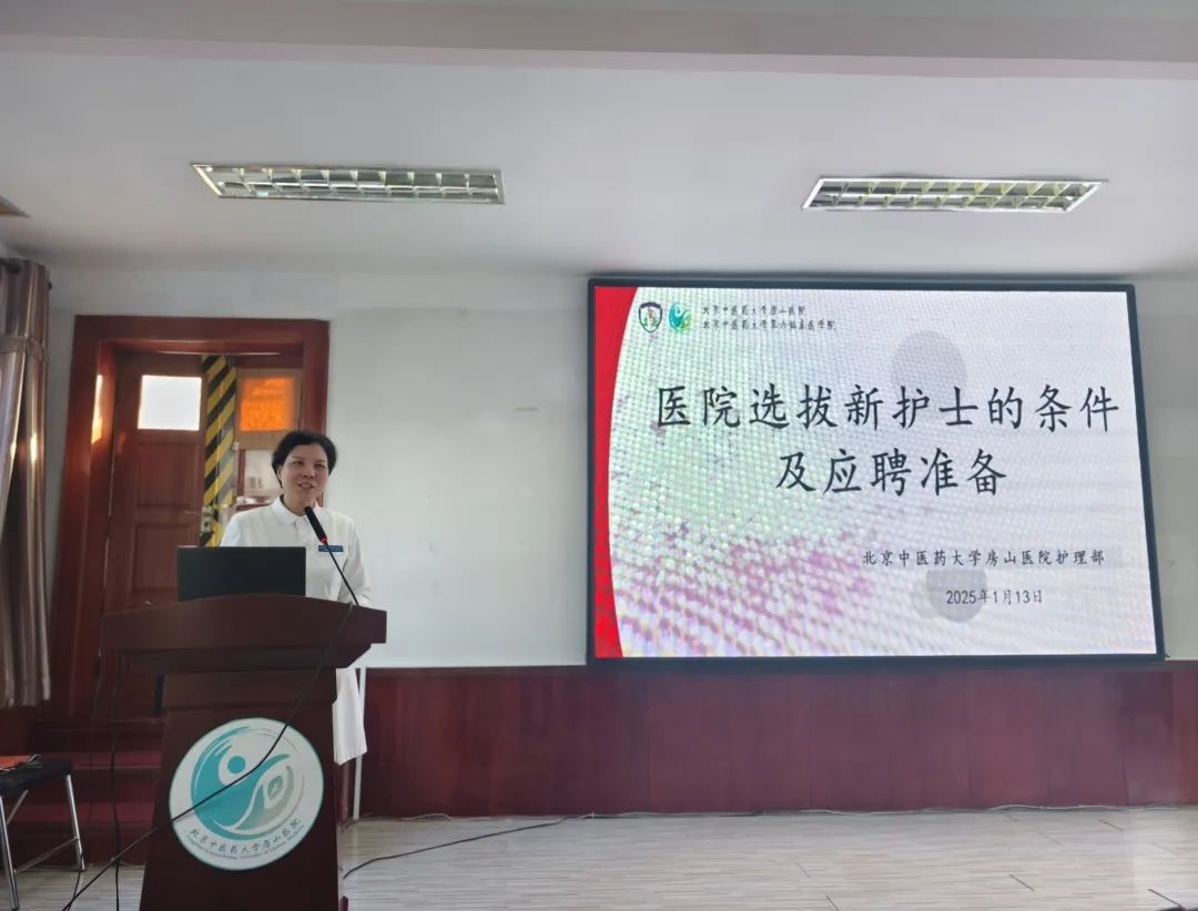 2025年1月13日,护理实习生就业培训在北京中医药大学房山医院学术报告厅召开,为即将步入职场征程的护理实习生们照亮了前行的道路。本次培训由护理教研室主任李玉凤主持,护士长王佳丽主讲培训内容,护理部总监郭海玲与护理部主任杨海鸥亲临现场,与全体实习生共襄盛举。