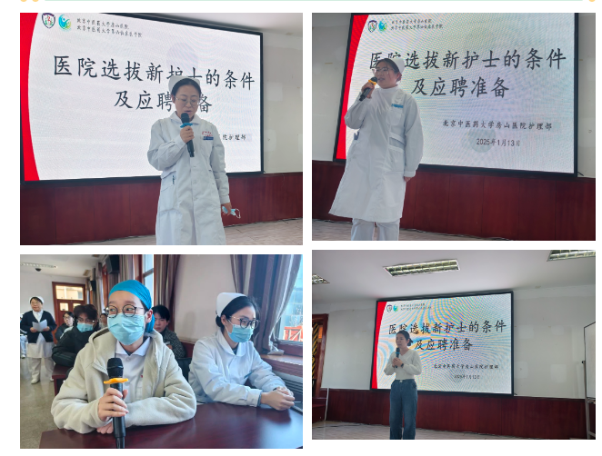 王佳丽护士长通过模拟面试的形式,生动展现了医院选拔新护士的标准及应聘准备的关键环节。在模拟面试环节,王佳丽护士长巧妙设计了多样化的面试场景,包括专业知识问答、技能操作展示、沟通能力评估等,细致解读了医院对新护士专业素养的高标准要求,如扎实的理论基础、熟练的操作技能和持续学习的动力。同时,她也强调了职业素养的价值,包括卓越的沟通技巧、团队协作精神、强烈的责任心和职业道德。