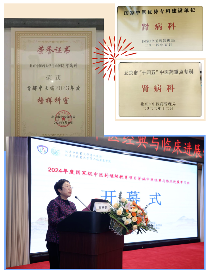 北京中医药大学房山医院肾病科建科二十余年,近三年在学术带头人孙鲁英院长的带领下、学科负责人孔令新主任的指导下,专科高质量发展,学术影响力不断扩大,先后获评北京市“十四五”首批中医药市级重点专科、“首都中医药榜样科室”。2024年凭借鲜明的中医特色、卓越的临床疗效、深厚的学术底蕴成功入选“国家中医优势专科建设单位”,标志着肾病科学科发展迈上新的台阶。
