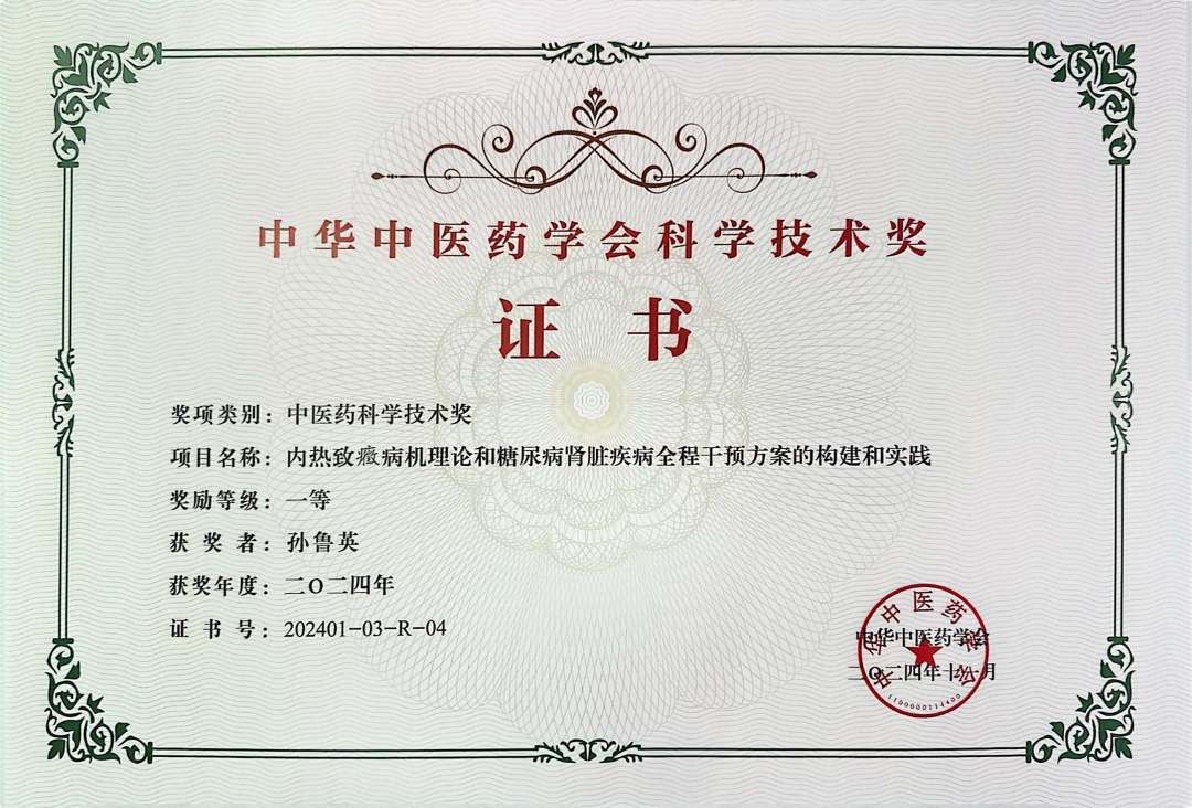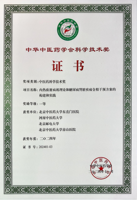近日,2024年度中华中医药学会科学技术奖获奖证书陆续颁布,由北京中医药大学东直门医院、河南中医药大学、北京邮电大学、北京中医药大学房山医院共同完成的“内热致癥病机理论和糖尿病肾脏疾病全程干预方案的构建和实践”项目荣获中医药科学技术奖一等奖。我院孙鲁英教授作为项目主要完成人之一,为项目的成功做出了重要贡献。