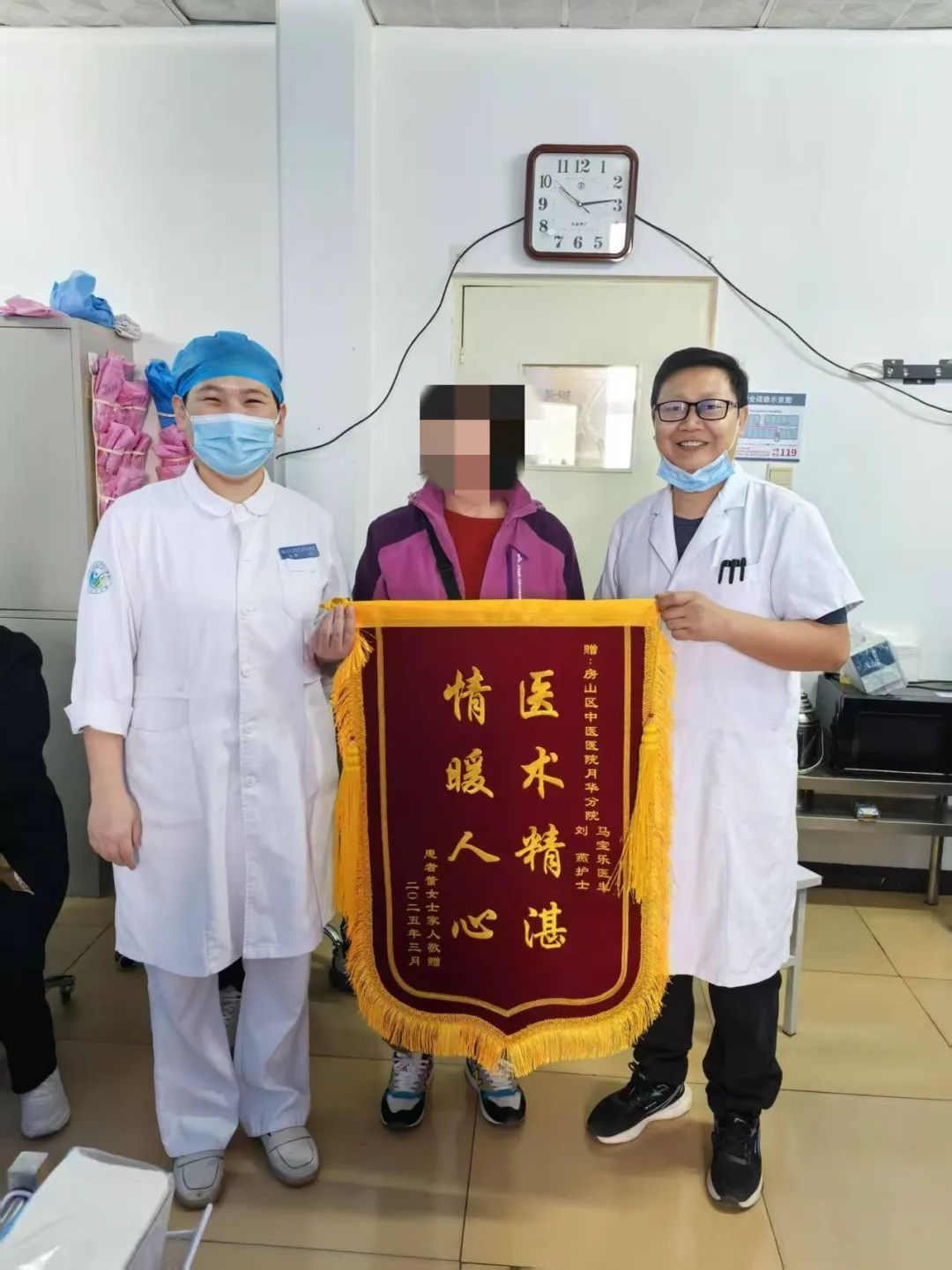在治疗过程中,刘燕护士也给予了董女士无微不至的关怀。她不仅协助马医生完成各项治疗工作,还时刻关注着董女士的情绪变化。每当董女士因为治疗过程中的不适或者对病情的担忧而感到焦虑时,刘燕护士总是耐心地安慰她,给她鼓励和支持。 经过长达两个月坚持不懈的治疗,奇迹发生了。董女士的耳聋恢复了90% ,曾经消失的声音,又重新回到了她的世界。她又能听到家人的亲切呼唤,能听到窗外鸟儿的欢唱,能感受到生活的美好。这份失而复得的喜悦,让董女士对马宝乐医生和刘燕护士充满了感激之情。为了表达这份深深的谢意,董女士特意制作了一面锦旗,送到了北京中医药大学房山医院月华分院。当她将锦旗递到马宝乐医生和刘燕护士手中时,眼中闪烁着激动的泪花。“是你们给了我重新聆听世界的机会,让我的生活又充满了希望。”董女士激动地说道。