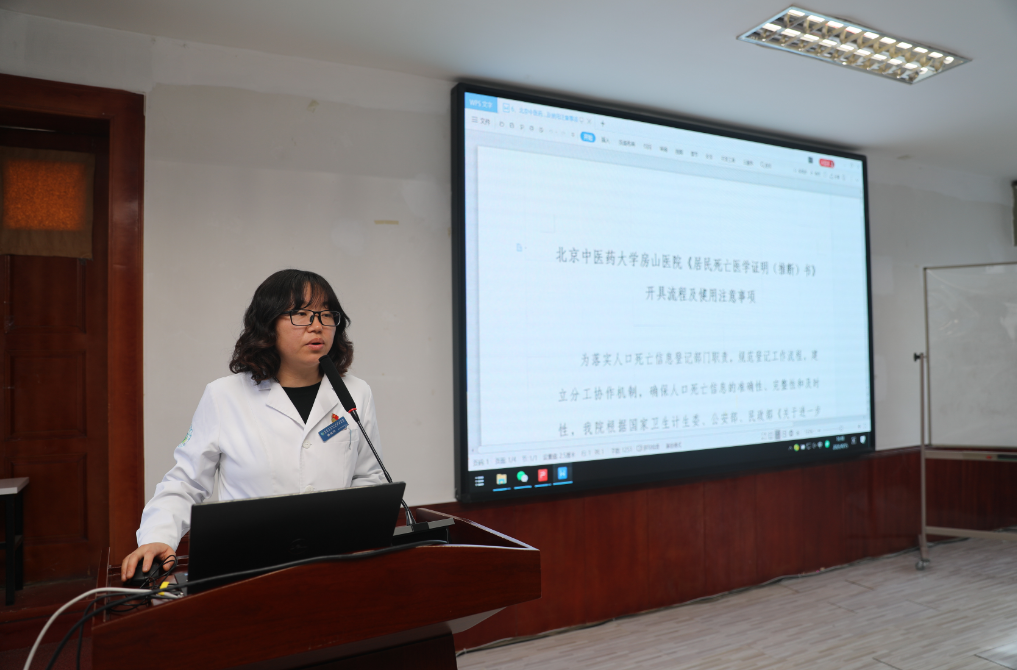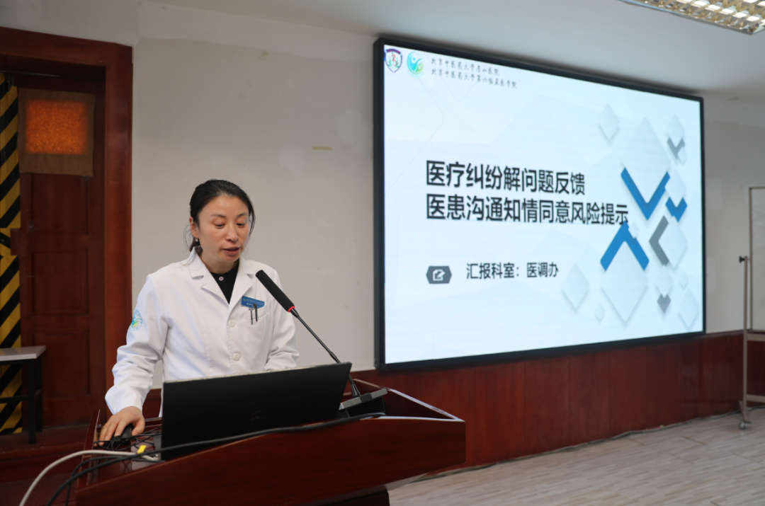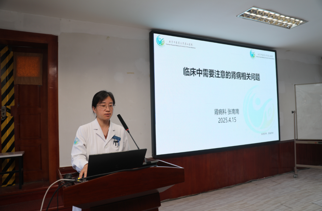 医务科代阿秋科长以国考相关的中医服务指标为切入点,从全院中医技术操作、中医为主治疗出院患者等运营数据出发,聚焦中医服务效能及改进措施;同时围绕胸痛中心建设、营养筛查问题反馈等提出了专项要求。门诊办、医调办、医保办、疾控科等职能科室相继发言,分别通报近期接诉即办、医保工伤检查、死亡证明开具规范等归口相关指标问题、政策导向,并提出相应的解决措施、整改方案。肾病科张南南副主任医师以《需要注意的肾病问题》做了专题分享。