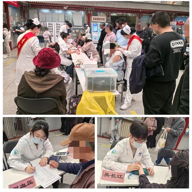 义诊活动开始后,门诊患者及其家属纷纷前来参与。医护人员全身心投入,义诊流程科学有序:登记信息、测量血压,询问症状、常规检查、中医四诊、提供治疗建议、健康宣教,环环相扣。