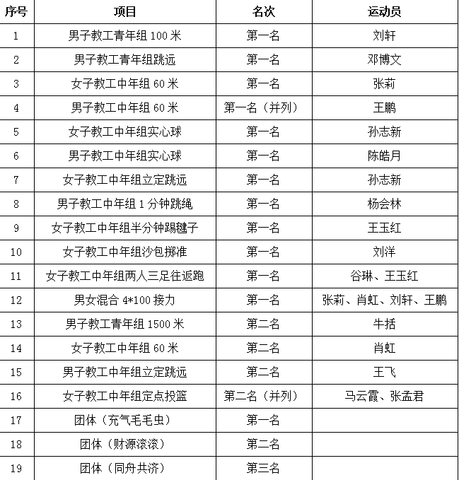 经过紧张激烈的角逐,各项比赛成绩陆续揭晓。运动员们表现出良好的竞赛水平和顽强的精神,本次获取佳绩如下: