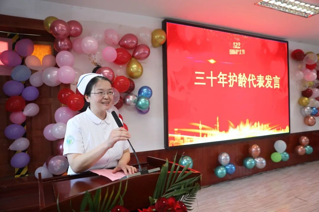 张井宣护士长代表30年护龄工作者畅谈了三十载芳华岁月,她们见证了医院日新月异的发展,将最美好的年华献给了护理事业,充分发挥了“传、帮、带”的作用,三十载无怨无悔。