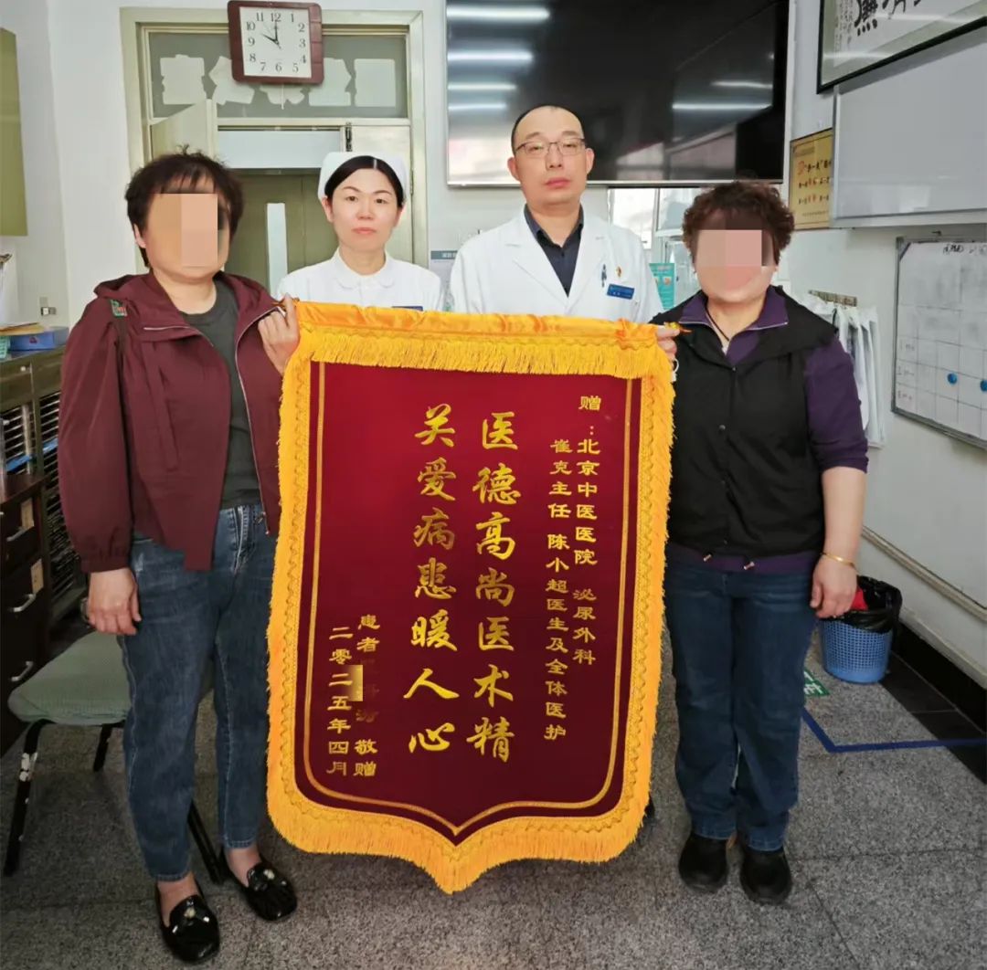 瞿大叔因为排尿不适来到泌尿外科就诊,经检查确诊为膀胱恶性肿瘤。面对严峻病情,崔克主任牵头制定个性化治疗方案,前期通过电切手术精准施治,成功切除病变组织并控制病情进展。后期联合化疗药物膀胱灌注治疗,最大程度保留膀胱功能,术后患者恢复良好,复查结果显示病灶清除彻底,生活质量显著提升,院13天好转出院。 住院期间,为缓解患者紧张焦虑的心情,主管医生陈小超多次耐心讲解治疗方案,用通俗易懂的语言分析病情,帮助患者树立对抗疾病信心,在治疗过程中,及时辨证分析证型,多次优化用药方案,在扶正固本的前提下增强免疫力,利用科室特色手指点穴加穴位贴敷,健脾补肾益气,预防术后胃肠道不良反应。责任护士每天耐心照护,从术前的全程护理和术后康复训练,到出院后的定期随访;从深夜值班时的贴心照护,到康复阶段的科学指导,泌尿外科医护团队用行动诠释了“以患者为中心”的理念,事无巨细,面面俱到。瞿大叔感慨道:“从病房到手术台,从住院到出院复诊,每一步都有人守护。他们不仅治好了我的病,更让我感受到了家人般的温暖。”经过系统治疗和定期随访,瞿大叔恢复良好,生活质量未受影响。为此他特意定制锦旗来表达感激之情。面对赞誉,泌尿外科团队表示:“患者的认可既是鼓励,更是责任。我们将继续深耕泌尿领域,依托精准微创技术、多学科会诊协作模式及全身心整体护理理念,帮助众多患者重获新生。用技术与温情守护每一位患者的健康”。一面锦旗,代表一份信任,一份康复的希望,在未来,我们必当不忘初心,以更优质的医疗服务和人文关怀,始终为健康保驾护航!以生命之名,践行医学温度!