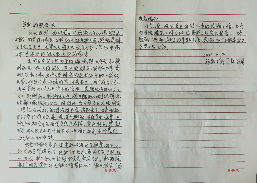 近日,北京中医药大学房山医院肺病2科收到一封特殊的感谢信。字里行间虽朴实无华,却盛满患者胡大爷一家对医护团队的真挚谢意,这不仅是对科室工作的认可,更定格了一段医患携手重获新生的暖心故事。