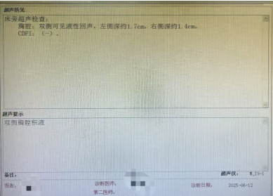 利水贴中的药物活性成分通过皮肤贴敷,经皮透入吸收,精确聚焦作用于胸壁局部及相关经络、穴位。相比穿刺引流等有创操作,贴敷治疗最大的亮点在于其简便、无创且副作用极轻微的特点。它免去了手术的痛苦与风险,避免了体液和营养的丢失,尤其适合体质虚弱或无法耐受有创操作的患者。其核心在于激发机体自身的水液代谢与气血运行能力,通调水道,宣肺行气,促进积液吸收与循环,旨在从根源减轻胸腔压迫。经过精准施贴与精心护理,一周后(6月12日)复查超声结果:左侧胸腔积液深度显著降至约1.7厘米,右侧胸腔积液深度降至约1.4厘米,双侧积液量在短期内均获得实质性吸收。伴随积液的有效控制,患者最直观的感受是:胸闷、气促明显缓解! 呼吸更加顺畅自如,整体生活质量得到了切切实实的提升。这种快速、无创的改善赢得了患者的认可与感激。