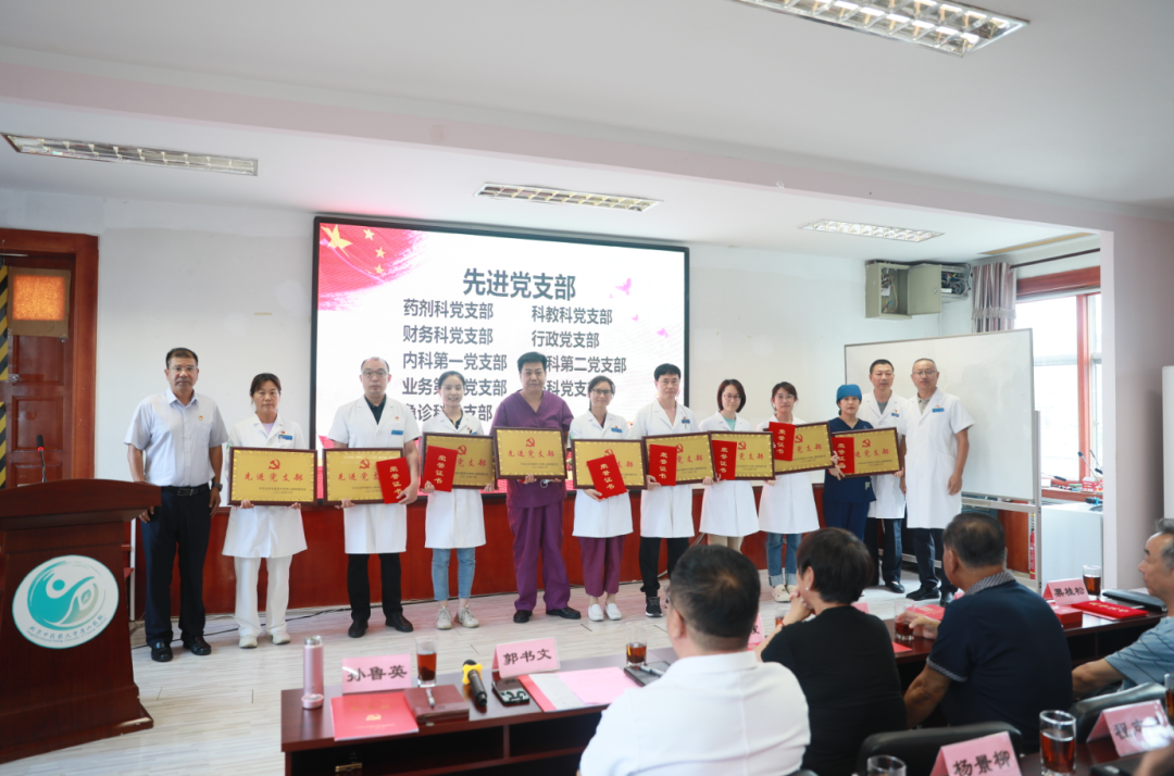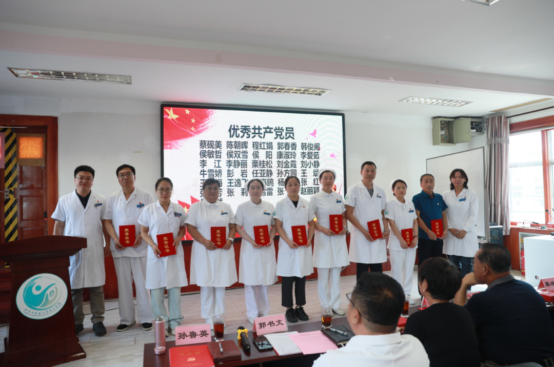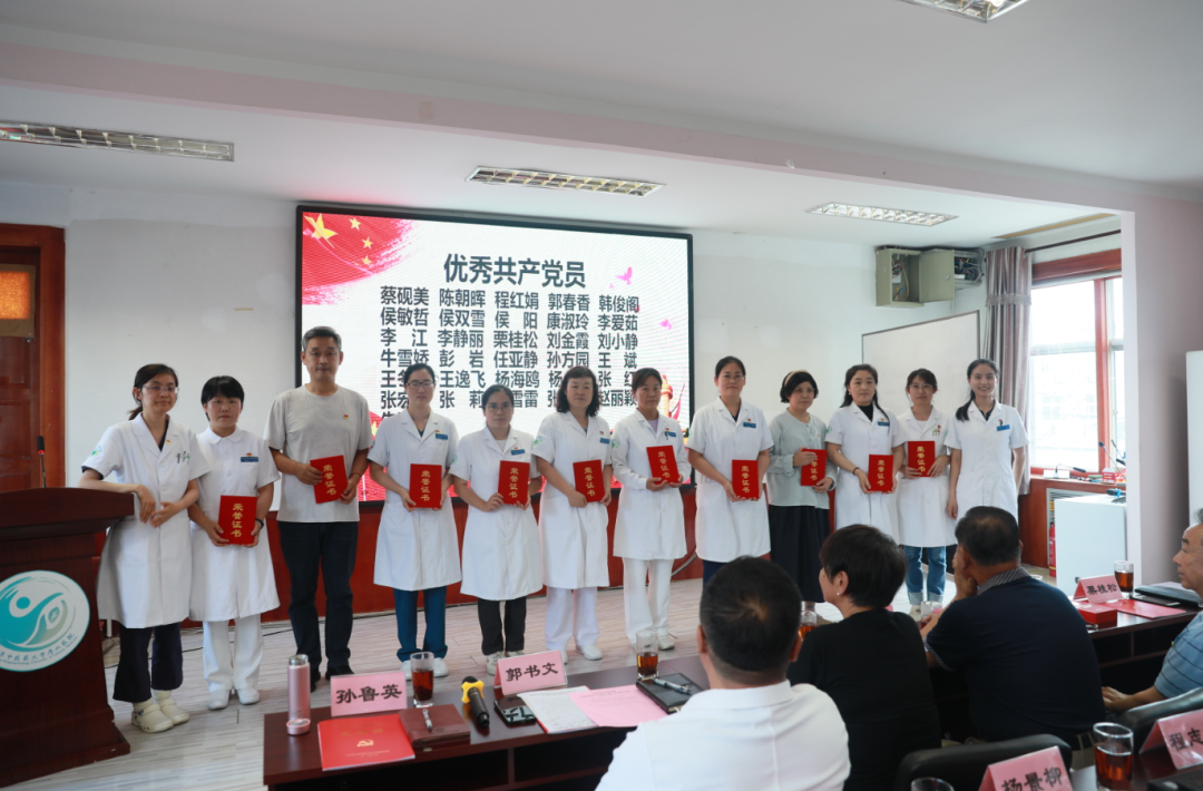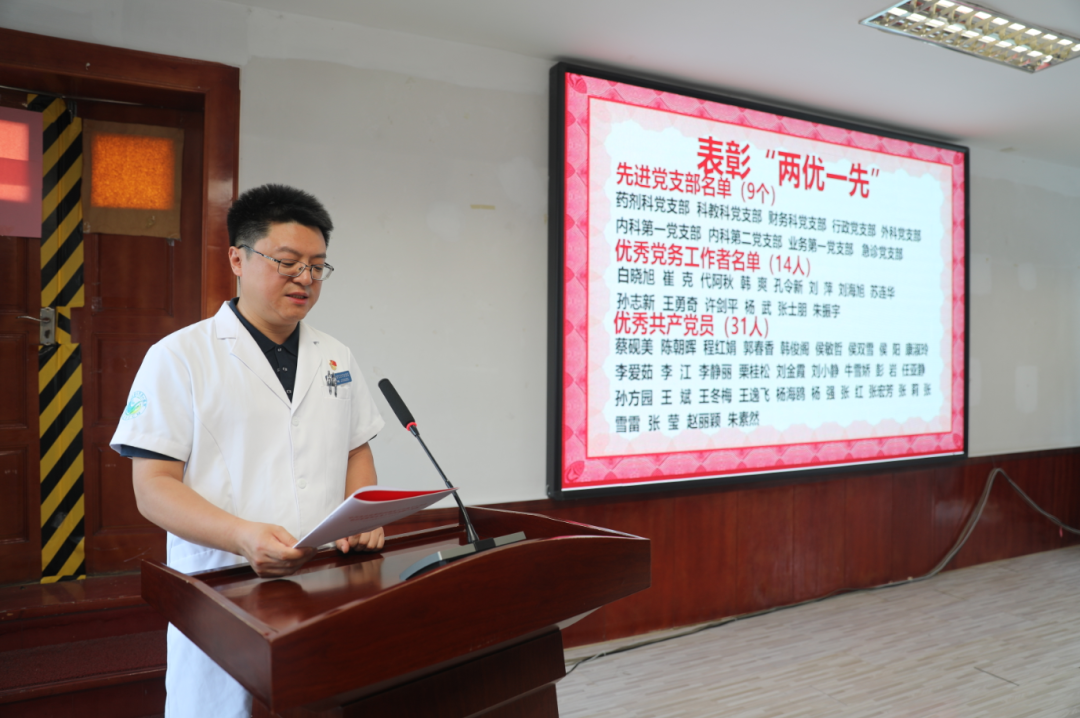 党委委员李鹏宣读医院党委“两优一先”表彰决定。李爱茹等31名优秀共产党员、刘萍等14名优秀党务工作者、药剂科党支部等9个先进党支部受到表彰。随后,医院领导为受表彰的个人和集体代表颁发荣誉证书和奖牌。一枚枚奖章、一张张证书,承载着获奖者们的辛勤付出与无私奉献,也激励着在场每一位党员以他们为标杆,奋勇前行。
