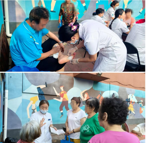 抵达社区后,医护团队迅速分工协作,高效搭建起临时义诊台。设置了健康咨询,中医切诊,血压检测,开展耳穴压丸,穴位贴敷等中医适宜技术治疗,以及发放宣教材料等,为居民提供免费诊疗服务。