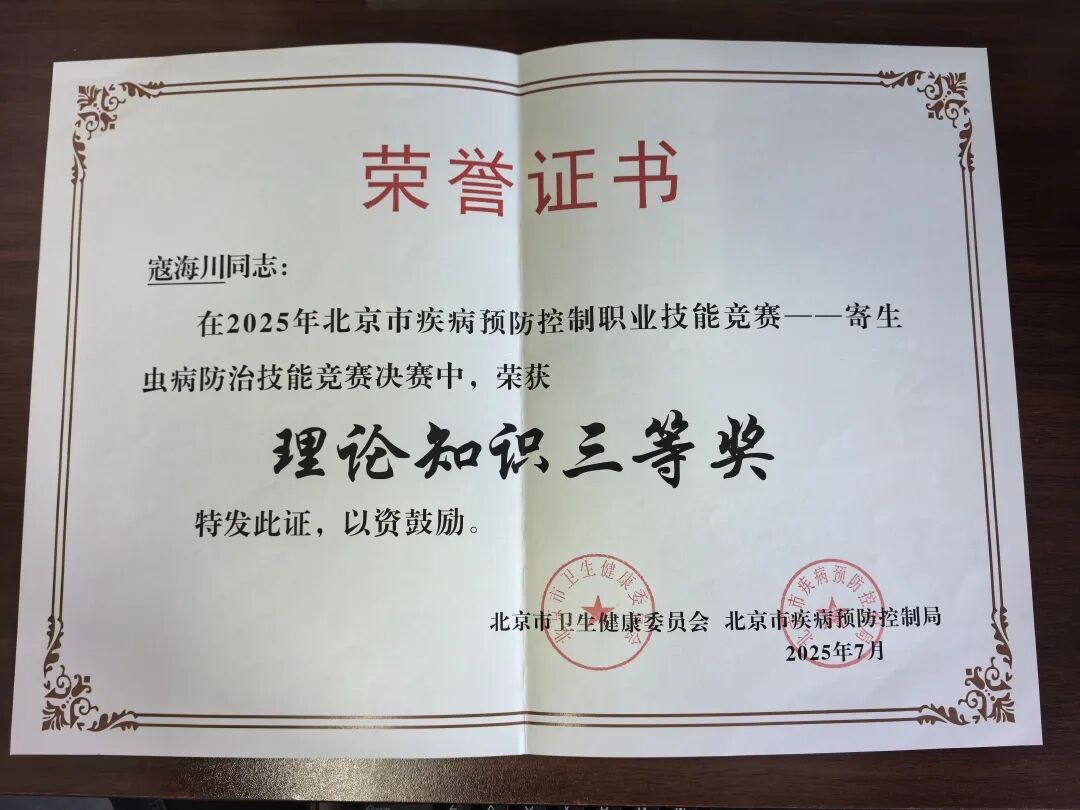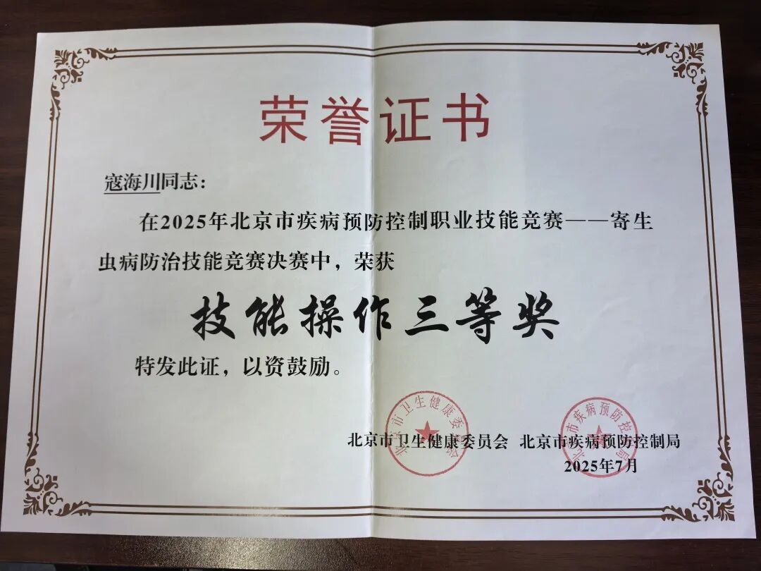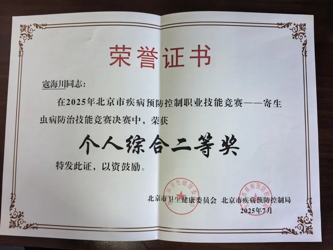为展现流行病学调查、寄生虫病和地方病防治人员精益求精的职业素养,以赛促学、以赛促练、以赛促用,北京中医药大学房山医院感染疾病科寇海川医生自今年5月份起依次参加了房山区疾病预防控制职业技能竞赛初赛、北京市疾病预防控制职业技能竞赛决赛和国家健康局综合司举办的2025年全国寄生虫病与地方病防治技能竞赛。通过多轮竞争,寇海川医生最终在2025年北京市疾病预防控制职业技能竞赛–寄生虫病防治技能竞赛决赛中荣获个人综合二等奖、理论知识三等奖、技能操作三等奖,并代表北京市参加2025年全国寄生虫病与地方病防治技能竞赛取得了优异的成绩。