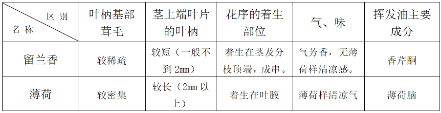 薄荷的混淆品主要是留兰香,两者同属于唇形科薄荷属植物,且都含有茎方形、叶对生的特征,主要区别如下: