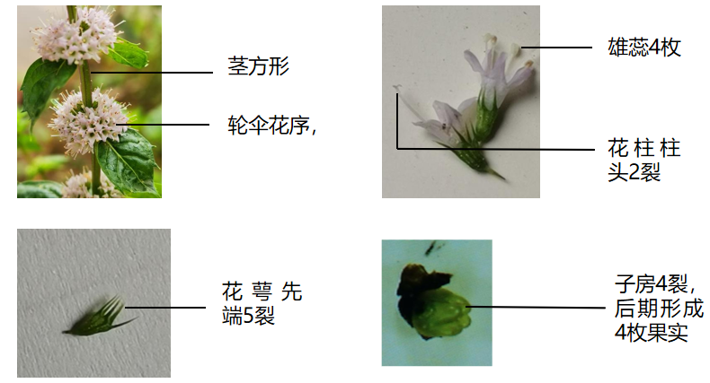 薄荷的茎呈四方形;花序为轮伞花序,长于叶腋处,花梗细;花萼绿色,管状钟形,花萼先端5裂,先端长锐尖;花冠白色或淡紫,上裂片2裂,较大,余3裂片近等大;花丝细,雄蕊4枚;花柱略超出雄蕊,雄蕊及花柱通常稍伸出花冠,先端2裂。除去花萼后,有4深裂的子房,发育成熟后为4枚果实。