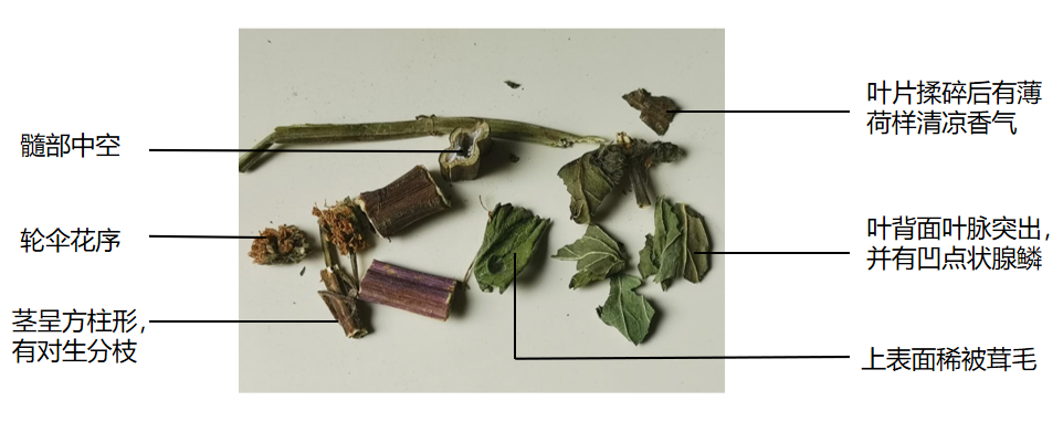 本品茎呈方柱形,有对生分枝,长15~40cm,直径0.2~0.4cm;表面紫棕色或淡绿色,棱角处具茸毛,节间长2~5cm;质脆,断面白色,髓部中空。叶对生,有短柄;叶片皱缩卷曲,完整者展平后呈宽披针形、长椭圆形或卵形,长2~7cm,宽1~3cm;上表面深绿色,下表面灰绿色,稀被茸毛,有凹点状腺鳞。轮伞花序腋生,花萼钟状,先端5齿裂,花冠淡紫色。揉搓后有特殊清凉香气,味辛凉。