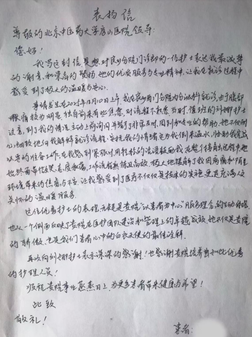 2025年12月的一个上午,朱女士因腹部胀痛独自来到科室就诊。陌生的环境与身体的不适让她焦虑不安,对就诊流程也格外生疏。正在值班的刘娜护士敏锐察觉到她的窘迫,主动上前询问情况,耐心细致地讲解就诊流程,柔声安抚患者情绪。为缓解不适,特意为患者倒来温水;在患者因紧张而忐忑时,又用轻松的话语给予鼓励。刘娜护士从就诊准备到检查结束,以关怀消解了患者的焦虑与不安,让她真切感受到:医疗不只是技术的传递,更是温暖的传递。对刘娜护士而言,这些是日常工作里的寻常举动;但对独自就诊的患者来说,却是驱散不安的光。她用耐心化解焦虑,用专业传递安心,让患者真切体会到,医疗服务从来不是冰冷的流程,而是有人情味的陪伴。这封跨越年末的表扬信,既是对刘娜护士个人专业素养与服务温度的肯定,也是对科室护理团队建设成果的生动见证。在“以患者为中心”的服务理念指引下,我们始终相信,优质护理从来不是一句口号,而是体现在主动上前的关切里,藏在耐心细致的讲解中,落实在每一个温暖患者的细节里。 这份迟来的手写表扬信,是患者对我们工作的认可,也是我们继续前行的底气。未来,内分泌科全体医护人员仍会带着这份温暖与责任,在每一个平凡的日子里,守护好患者的健康与安心,让“白衣天使”的温柔力量,在每一天的陪伴里延续下去。