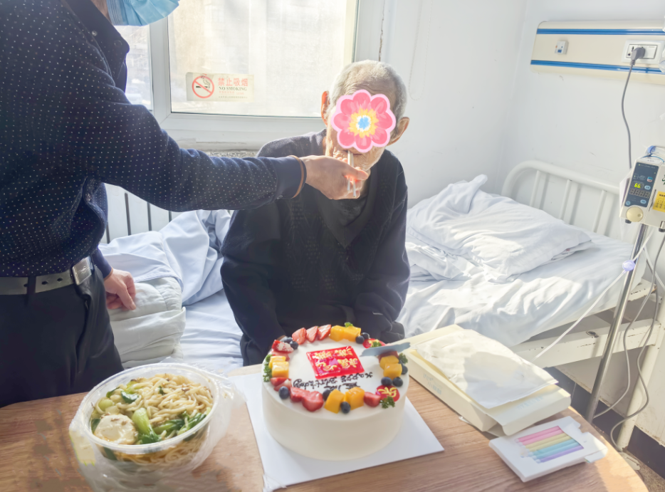 面条被特意煮得软烂,并用厨房剪刀细心剪短——这是护理团队基于对爷爷吞咽功能的日常观察,为防止呛咳采取的措施。 汤头清淡少盐,符合高龄脑血管疾病患者的饮食原则。蛋糕选择了最低糖度的款式,“福气满满”的红字映着新鲜的果粒,只为仪式,不为多食。一碗面条、一个蛋糕,看似简单,却处处是护理专业的“隐形守护”。