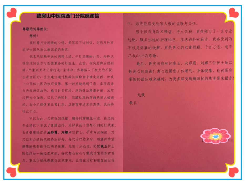 吕女士素来信赖中医调理之道,此次突发脚后跟剧痛,严重到无法正常行走,生活和工作都陷入了极大的不便。在西医建议进行核磁共振检查时,她却一心坚信中医的诊疗效果,第一时间想到了医术与医德兼备的西门分院刘萍院长。 刘萍院长为她辨证施治,施以针灸疗法。她的针法精准老道,治疗过程专业细致,仅扎了两回针,吕女士脚后跟的疼痛感便大幅减轻,如今已恢复正常行走。这份“雪中送炭”的恩情,让她始终铭记于心。不仅如此,针对吕女士颈椎、腰部时常酸胀不适的老问题,刘萍院长建议的中医非药物治疗也收获了意想不到的好效果。负责中医非药物治疗的及彩霞、刘娜两位护士,手法专业娴熟,对穴位和力道的把控恰到好处,每次治疗结束后,颈腰部的紧绷酸胀感都能得到明显缓解,见效十分迅速。而付晓玉护士则始终如一地温柔周到,每次都会耐心叮嘱日常养护要点,事无巨细地提醒注意事项,让她在治疗和恢复的过程中,始终能感受到家人般的温暖与关怀。 ? ??“您不仅自身医术精湛、待人亲和,更带领出了一支专业过硬、服务热忱的护理团队。在您的科室就诊,我感受到的不仅是病痛的缓解,更是身心的双重慰藉。”吕女士在信中这样写道。一封感谢信,传递的是医患之间的信任与温情,彰显的是中医特色疗法的独特魅力,更映照出房山中医院西门分院“以患者为中心”的服务理念。未来,我们将继续坚守初心,传承中医精髓,以更精湛的医术、更优质的服务,用心守护每一位患者的健康,让中医的温暖惠及更多身边人。