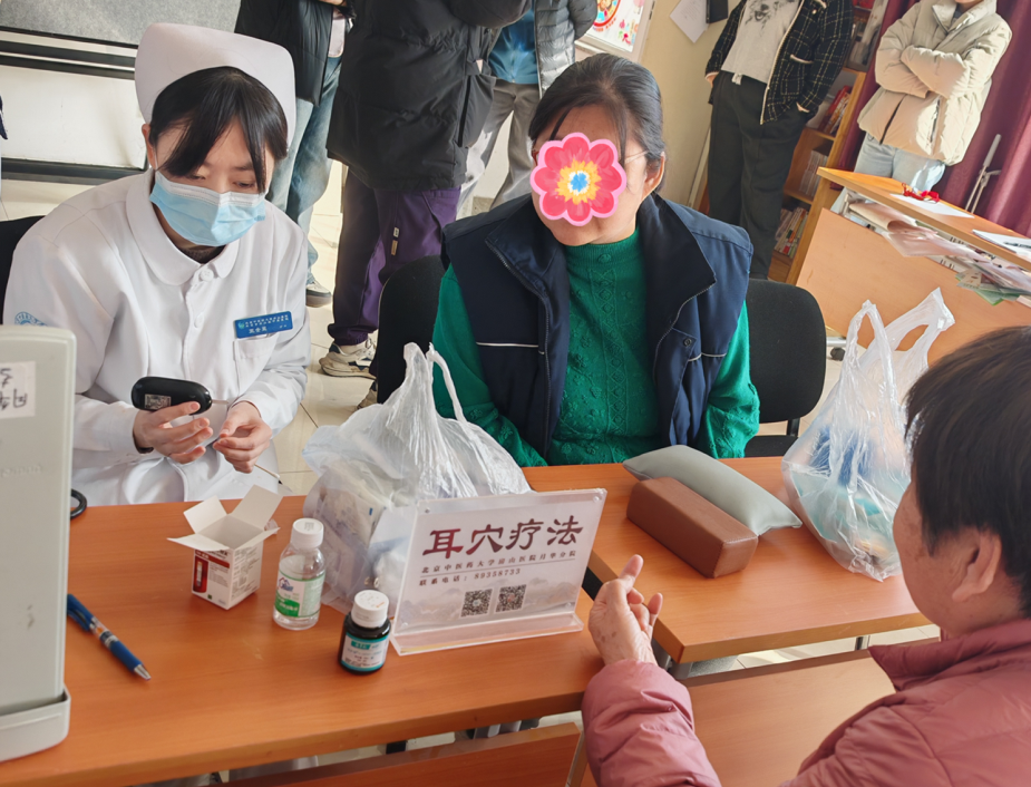 医护团队还为教职工们提供了测血压、血糖服务。同时,中药穴位贴敷、耳穴压丸等中医特色疗法也同步开展,针对失眠、肠胃不适等问题,医护人员精准取穴、规范操作,穴位贴敷温通经络;耳穴压丸通过按压刺激耳穴调节脏腑气血,无创舒适、老少皆宜。