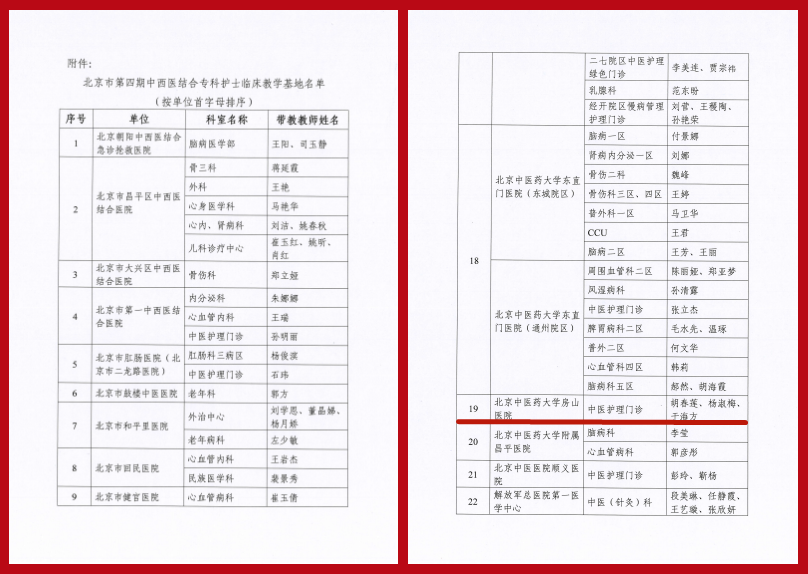 为进一步加强中西医结合专科护理人才培养,提升临床教学基地建设水平,由北京中西医结合学会与北京市中医护理能力提升工程办公室共同组织开展了北京市第四期中西医结合专科护士临床教学基地遴选工作。最终确定30家单位的105个科室为北京市第四期中西医结合专科护士临床教学基地。北京中医药大学房山医院中医护理门诊凭借雄厚的中医护理实力、完善的临床教学体系与突出的专科培养能力,成功入选北京市第四期中西医结合专科护士临床教学基地,这也是我院护理学科建设迈向新高度的重要里程碑。
