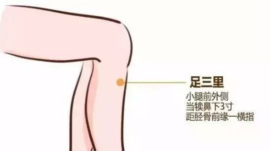 5、足三里:外膝眼下3寸,胫骨外侧1横指处。健运脾胃、补中益气、增强体质、延年益寿,本穴自古就是预防保健的要穴,对循环、消化、神经、血液及内分泌、呼吸等系统均有调整作用;可针灸。
