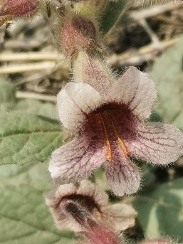 我是多年生草本植物,个子虽然不高,但是我具有很高的药用价值。我浑身是毛,叶片的生长也很有意思,伏在地面上的叶子连在一起的生长,看上去像是莲座,很多人形容我的基生叶是莲座状的。再往上面长的叶片逐渐缩小而相互生长的;叶片边缘有不整齐的钝锯齿。再往上面就是你看到的“小喇叭”了。植物学家们称之为总状花序顶生,花萼呈钟状,花冠呈筒状,花冠外面紫红色,内面常有黄色带紫的条纹,花冠顶部具5裂,略呈二唇形……