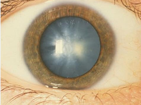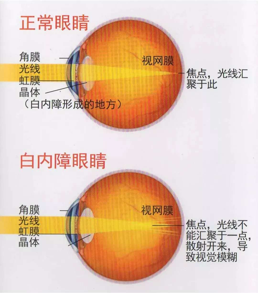 各种原因如老化,遗传、局部营养障碍、免疫与代谢异常,外伤、中毒、辐射等,引起晶状体代谢紊乱,导致晶状体蛋白质变性而发生混浊,称为白内障,此时光线被混浊晶状体阻扰无法投射在视网膜上,导致视物模糊。