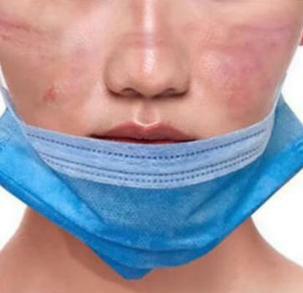 (2)长时间佩戴口罩,皮肤出现深在勒痕,皮肤屏障受损,从而导致皮肤干燥、脱屑,自觉瘙痒。