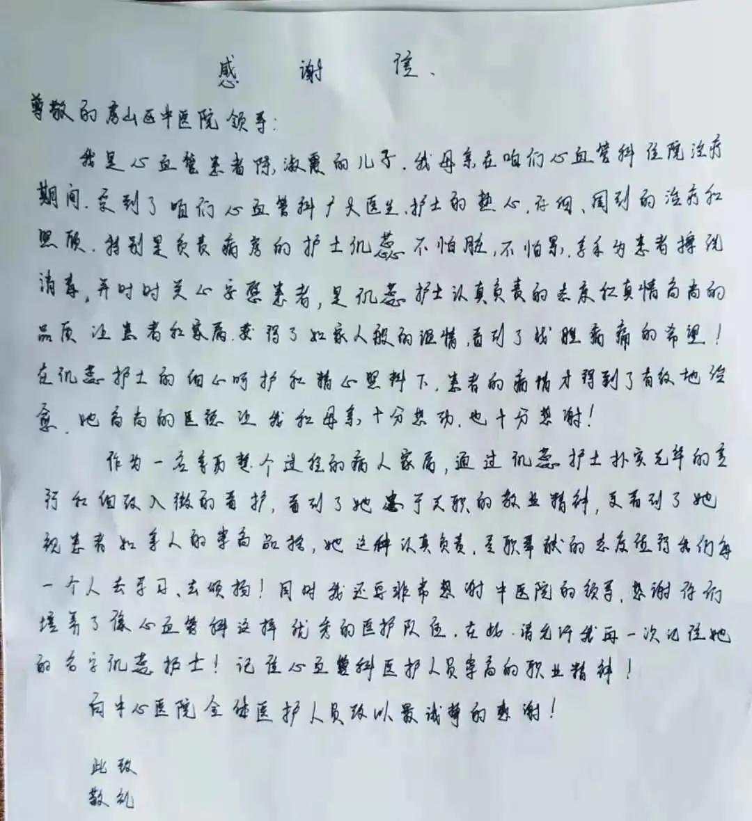 一张白纸,一行素字,没有夸张的语句,也没有华丽的修饰,简单的文字叙述了医患之间最真挚最朴实的情感。看到这封表扬信,我们医护人员内心也倍感温暖,我们也应该感谢这位患者及家属,感谢他们对护士们的工作报以肯定,正是这份肯定让他们坚定了自己救死扶伤的信念!