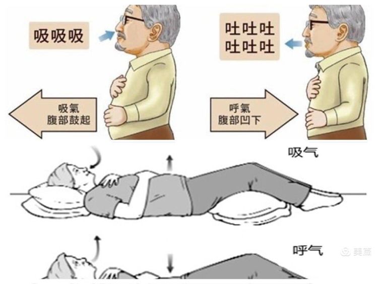 中医有“呼吸到脐,寿与天齐”之言,便是腹式呼吸。患者仰卧床上,放松肢体,思想集中。由鼻深长而缓慢吸气(鼓起肚皮)3~5秒,屏息1秒,然后由嘴徐徐将气呼出(回缩肚子)3~5秒,屏息1秒。每次5~15分钟,做30分钟最好,每天1~2次。腹式呼吸可使肺泡得到锻炼,改善肺功能增加肺活量,利于康复。