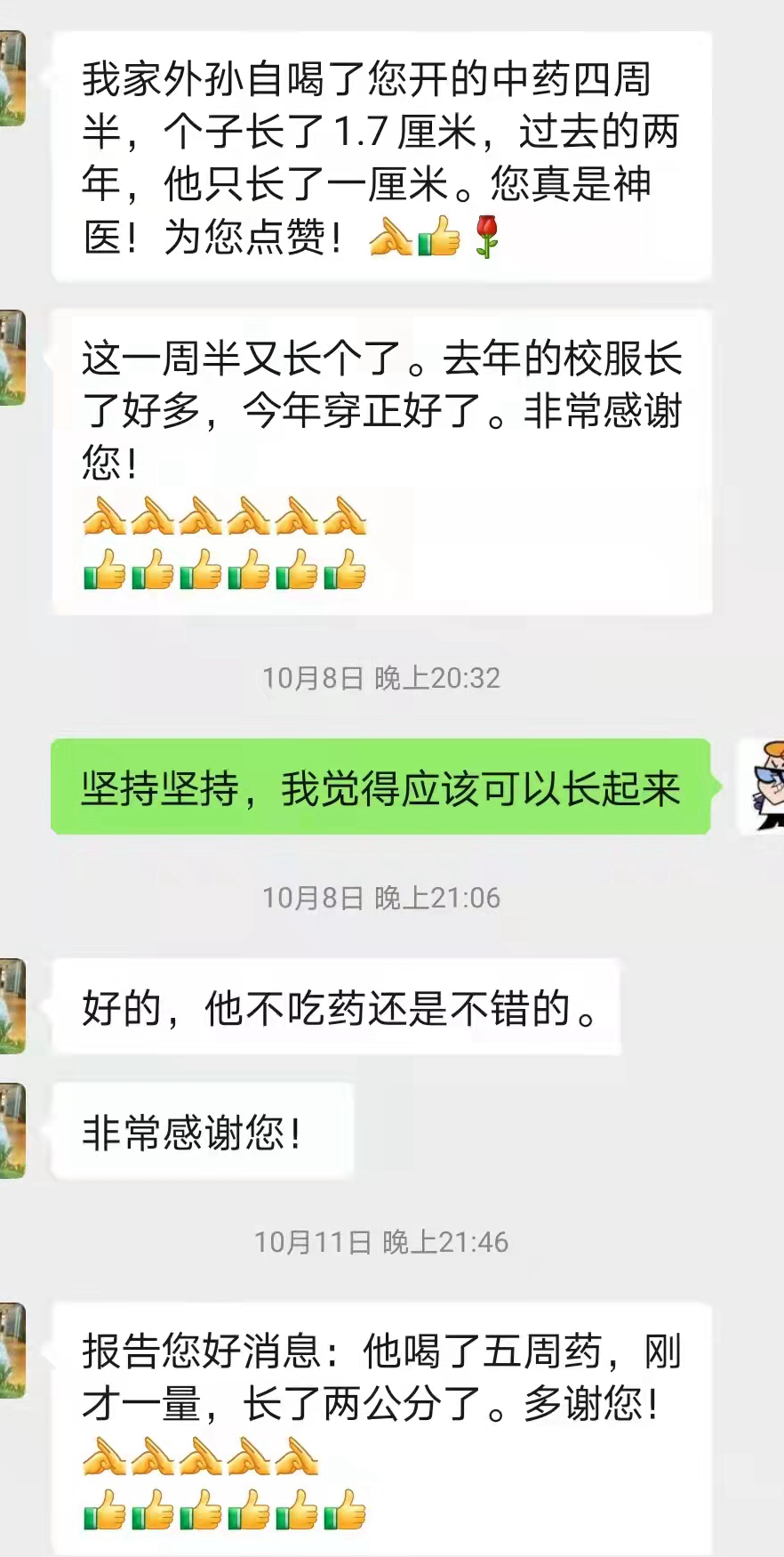 第二位就是蔡阿姨的外孙,今年12岁,一直有风湿病,小时候基本就是一个月一住院,身高一直不长,现在已经上初中了,可身高只有130cm,大人孩子都很着急,也是东奔西走了很多地方,没有见到成效。于是在刘阿姨的推荐下,蔡阿姨特意带孙子来找王医生治疗,王医生通过辨证论治,在3个月的时间里这位中学生身高增长了3厘米,孩子是那般喜悦。短短的3个月,孩子和王医生也交起了朋友,看病的过程中,孩子也时常会和王医生聊自己喜欢的三国时期的历史,有时候他得了一些奖状也会带来门诊和王医生分享喜悦。