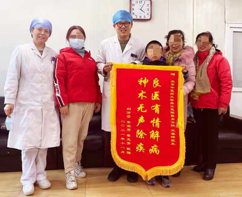2021年11月30日下午,北京中医药大学房山医院良乡分院办公室接待了五位来访者,其中一位阿姨手里拿着锦旗,上面写有“良医有情解病 神术无声除疾”字样。