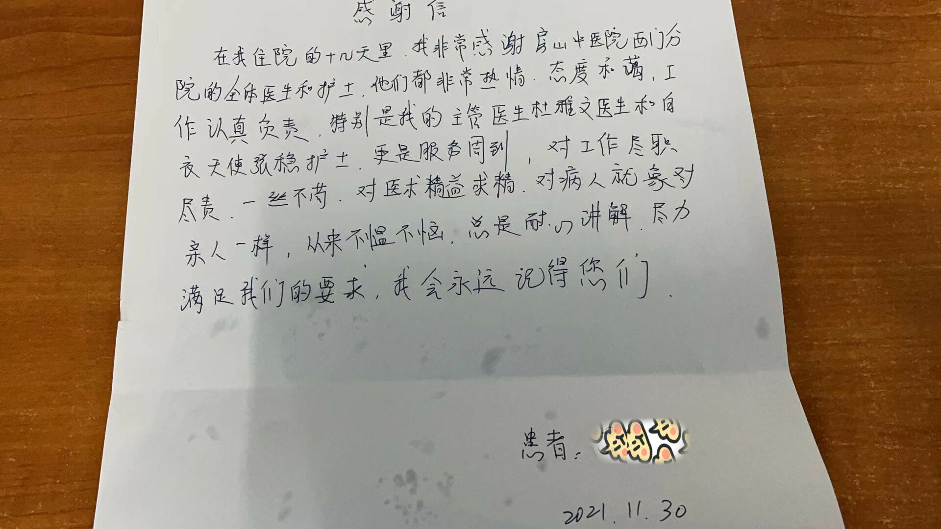 在这个特别的日子,西门分院既收到了患者送来的锦旗,同时又收到了其他患者的感谢信,感谢信虽然简单,但句句发自肺腑,这是一位HPV16感染术后阳性的患者,对西门分院医护人员表示感谢,特别表扬主管的杜雅文医生和护士张稳,在住院期间给予患者无微不至的帮助和热情服务。