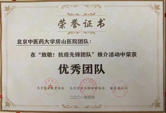 近日,北京中医药大学房山医院在北京健康教育协会、北京有害生物防制协会、《健康》杂志社联合开展的“致敬 抗疫先锋团队”推介活动中获得“优秀团队”称号。此次活动旨在弘扬伟大抗疫精神,鼓励先进,树立典型,做好疫情防控常态下的爱国卫生工作。我院自接到通知后积极组织申报材料,总结疫情期间先锋事迹,经过两轮的专家评审,最终获得这一殊荣。