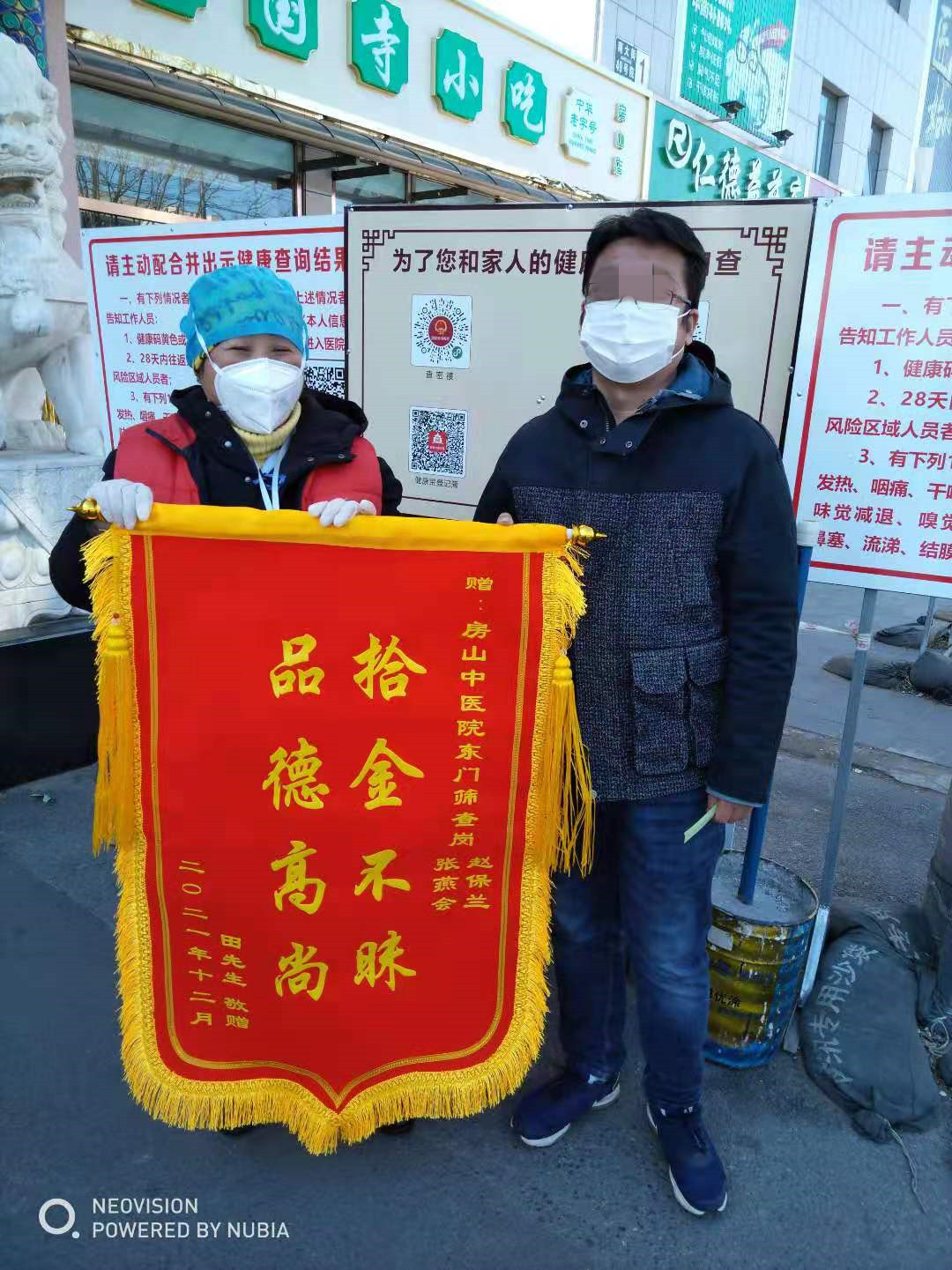 2021年12月11日,北京中医药大学房山医院东门筛查岗收到一位田先生送来的锦旗,锦旗上赫然写着“品德高尚 拾金不昧”几个大字。