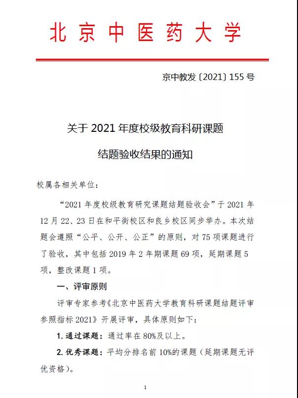 2021年12月24日,北京中医药大学房山医院张红主任医师申报的北京中医药大学教学研究课题“基于医教协同育人机制的中医临床课间见习课程教学方法研究与实践”历经2年的研究与实践,完成结题答辩,顺利结题。