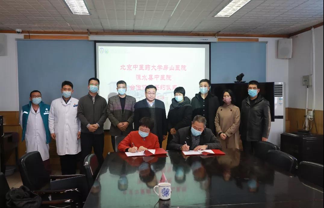 2021年12月31日上午,北京中医药大学房山医院与涞水县中医院举行了友好医院合作签约仪式。涞水县中医院院长张颇、副院长梁秀军和黄翠香等5人,北京中医药大学房山医院党委书记郭书文、院长孙鲁英、副院长杨景柳及各职能部门负责人一起参加了签约仪式。