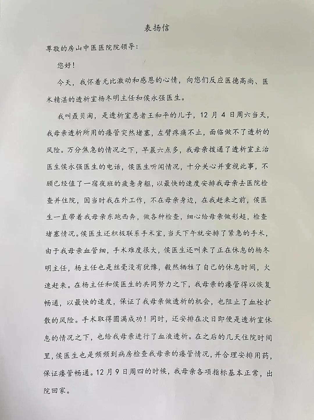 患者王某,于12月4日透析当日清晨6点内瘘堵塞,自觉左臂疼痛难忍,内瘘震颤消失。因为平时宣教到位,患者没有表现出恐慌,不知所措,而是给透析室打电话,询问该如何处理。杨东明主任和侯永强大夫主要负责透析室的内瘘建立和修复工作。侯永强大夫接到电话后,虽然为患者着急,但是语气平稳,安抚患者,嘱咐患者来医院做彩超,评估内瘘堵塞情况,又通知手术室,紧急安排手术。因为当天就是患者透析的日子,这次又是间隔两天半,患者水负荷较大,有心衰风险。侯大夫急在心里,多年的工作经验使他沉着冷静,不顾已经工作24小时的疲惫身体,以最快速度赶到医院,检查内瘘的堵塞情况,安排患者检查入院。由于患者血管细,难度大,又通知正在休息的杨东明主任。一个小时的时间,杨主任连同侯大夫一起圆满成功完成了手术。