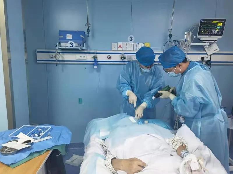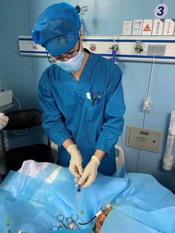 家属把外院的治疗意见与主治医师进行沟通,不想放弃一丝希望。得知我院可行颅内血肿微创穿刺清除术,故家属找到了重症医学科,经颜家华主治医师充分评估病情,建议可以行颅内穿刺血肿碎吸术治疗,减轻颅压,挽救生命,改善患者症状及预后,家属重新燃起了希望,患者转入重症医学科。为防止病情进一步加重,当天随即完成颅内血肿穿刺点CT定位,护士做好充分术前准备,全科医护配合,经过1个小时有条不紊、沉着冷静、娴熟地完成了颅内血肿穿刺,当即抽出暗红色血液20ml,手术非常顺利。之后给予持续引流。
