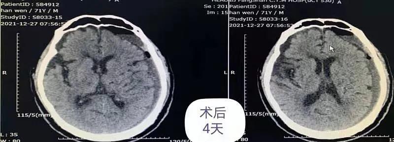经过手术治疗,患者病情有了立竿见影的缓解,患者意识转清,肢体活动不利明显好转,家属得知患者的病情改善后感激万分。我们丝毫不放松,明确观察有无术后并发症及脑血肿并发症,严格无菌操作,加强护理,防止坠积性肺炎及预防静脉血栓。