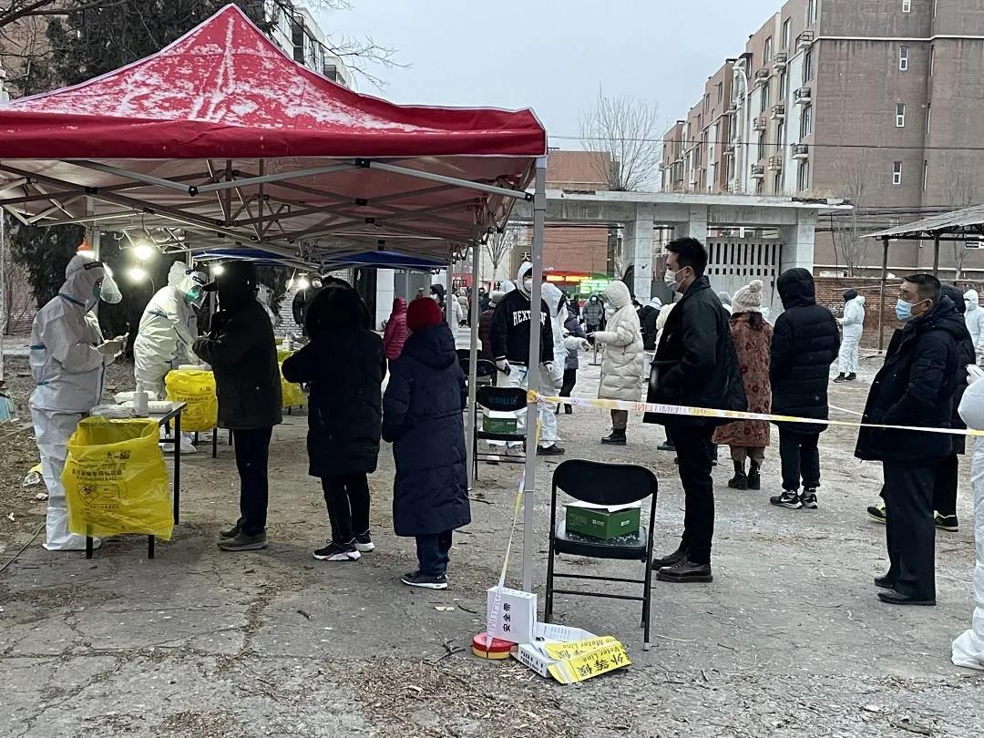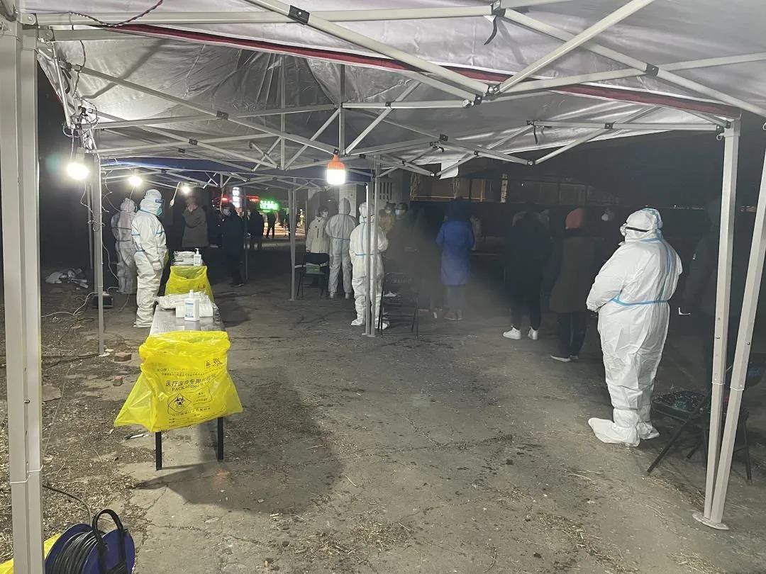 社区工作人员帮我们搭建了简易帐篷,6:30采集筛查工作正式开始,居民在社区工作人员的疏导下陆续进场。在采样点我们挑战寒冷与时间赛跑,尽全力阻断疫情传播,对每一位居民严格认真地进行采样,没有一丝马虎和放松。室外采集温度在零下10度左右,虽然做了防寒措施,但佩戴的防护面屏依然结了冰,双手依然冻得通红麻木,但没有一个人喊累、没有一个人喊停、没有一个人喊退缩。到了中午还有居民陆续到来。下午2:30采集任务才结束。
