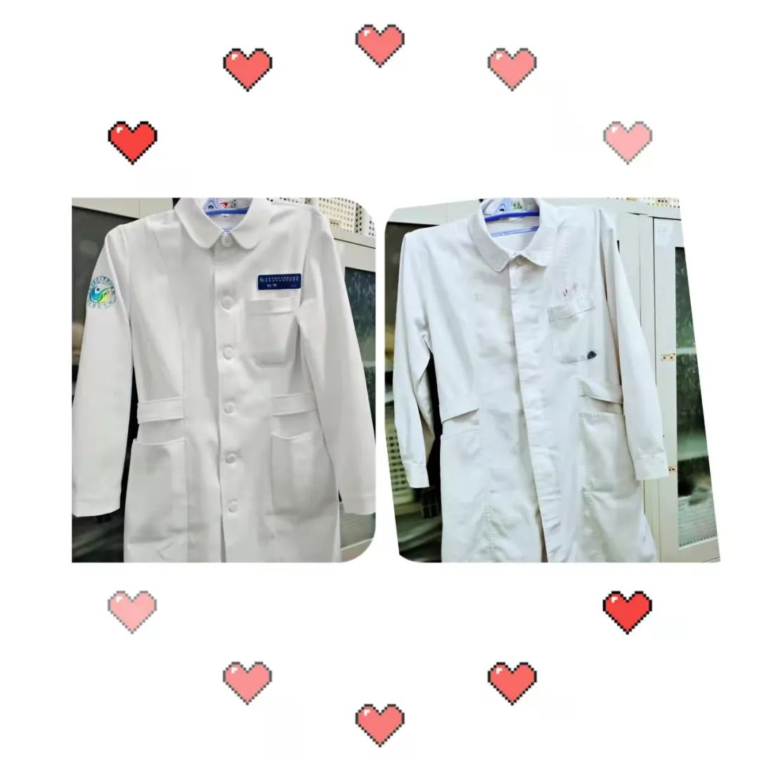 上面口袋有两个恢复不了的小洞洞,那是别着我小小工作牌的痕迹,最开始的无名字实习牌,红色工号牌,再到现在的蓝色姓名牌,这两个小洞洞一直在成长,腰杆子也越来越硬,现在居然都不自己恢复原样了,留下了永恒的痕迹。
