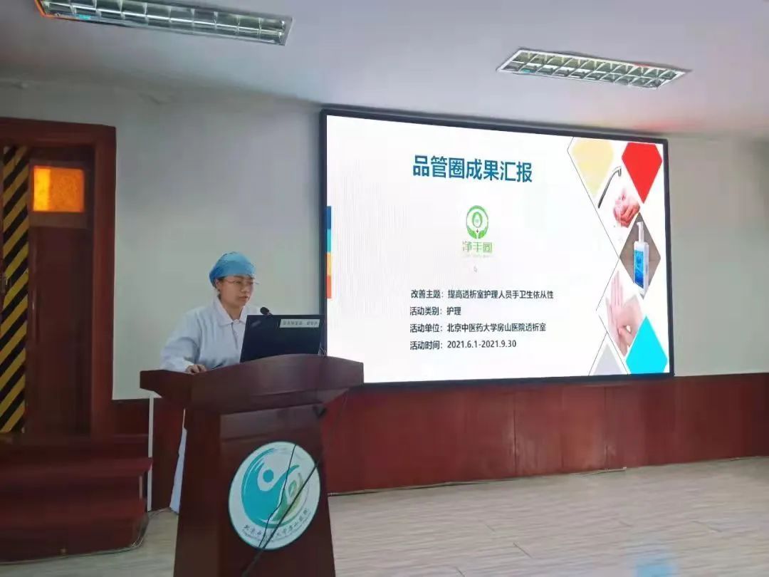 北京中医药大学房山医院透析室于2021年6月至9月开展“品管圈—净手圈”,历时四个月,严格按照PDCA的工作模式进行,主要监督透析室护理人员的手卫生实际执行情况。定期检查洗手情况;定期考察关于手卫生的理论知识与实际操作,以掌握手卫生的管理效果;表扬并奖励手卫生依从性成绩最佳的人员。通过净手圈的实施,透析室护理人员的手卫生依从性提高提高了31%,品管圈目的达成,并在医院2021年度品管圈评比中荣获“一等奖”。