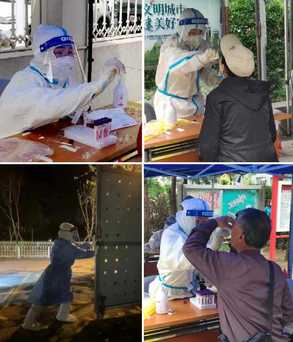春寒料峭,坚持完成每一份采集任务,做到一人一消毒,冰冷的消毒水已让他们被层层包裹的手指冰凉到麻木。炎炎烈日下,汗水浸透衣衫。为了不耽误任务进度,大家采核酸前,默契的不喝水,一心投入到战斗当中。初春的夜晚,他们却无暇感受春光,有的只是挑灯夜战,与病毒赛跑的铿锵。